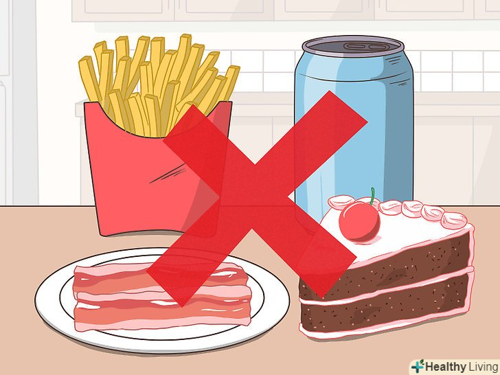 Не їжте продукти з порожніми калоріями.для деяких людей саме в цьому і полягає вся проблема. Певні продукти набагато легше перетворюються в вашому тілі в жир. Вони є джерелом великої кількості калорій, але крім цих калорій в них не міститься поживних речовин і клітковини, які потрібні вашому організму для здоров'я. Перший крок до позбавлення від жиру - це обмеження вживання таких продуктів:- Цукор. Солодкі газованої води, Випічка і цукерки можуть привести до значного накопичення жиру.[5] якщо ви обмежите вживання подібних продуктів, то цілком можливо, що результати будуть видні вже на першому тижні.