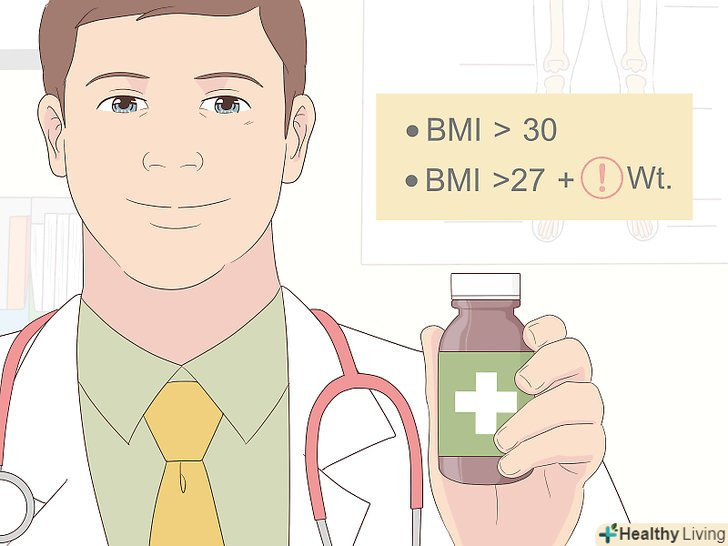 Обговоріть з лікарем препарати для схуднення.було показано, що деякі препарати ефективно допомагають скинути вагу.[15] даний спосіб може підходити вам в тому випадку, якщо ваш індекс маси тіла (ІМТ) перевищує 30, або він більше 27 і ви відчуваєте через зайву вагу проблеми зі здоров'ям, наприклад, у вас цукровий діабет або високий артеріальний тиск. Порадьтеся з лікарем щодо такого способу, а також обговоріть з ним можливі побічні ефекти подібних препаратів. Нерідко для схуднення приймають такі засоби:[16]- "Орлістат";