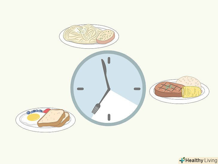 Дотримуйтесь дієти з періодичним голодуванням .при періодичному голодуванні вживають їжу лише протягом 8 або 10 годин протягом дня, під час найбільшої активності. Для багатьох підходить час між 7 ранку і 5 годинами вечора. Проте, можна вибрати такий інтервал, який краще підходить саме вам. Просто кожен день їжте тільки в намічений час, так щоб встигало пройти 14-16 годин між останнім прийомом їжі в кінці дня і наступним сніданком.[6]- Наприклад, можна снідати о 7:00, обідати о 11:00 і вечеряти о 15:00, якщо ви хочете приймати їжу протягом 8-годинного інтервалу і голодувати протягом 16 годин.
