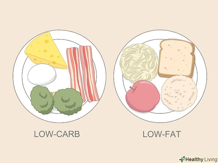 Спробуйте дотримуватисяНизьковуглеводну або низькожирову дієту.обидві ці дієти допомагають скинути вагу завдяки тому, що вони обмежують кількість калорій, споживаних з певними видами їжі. Необхідно вибрати таку дієту, яку ви зможете дотримуватися протягом тривалого часу. Якщо вам подобається їжа з малим вмістом вуглеводів, наприклад яйця, бекон, сир і некрохмалисті овочі, вам підійде низьковуглеводна дієта. Однак якщо ви не можете обходитися без фруктів, хліба, макаронів і рису, краще вибрати низкожировую дієту.- Пам'ятайте, що найважливіше обмежити споживання калорій і підтримувати їх дефіцит. Ви не скинете вагу, якщо не знизите загальну кількість споживаних калорій.