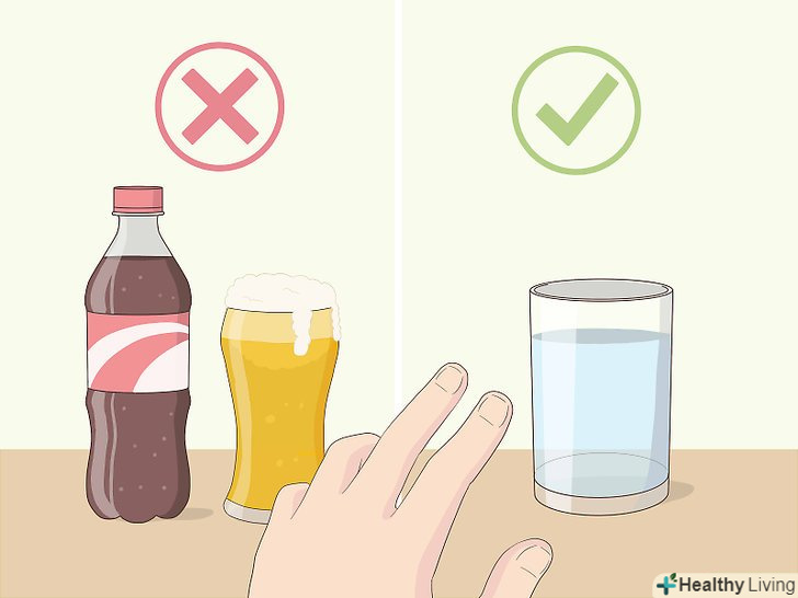 Пийте більше води, а не інших напоїв.вода не містить калорій і забезпечує організм рідиною, яка необхідна йому для нормальної роботи. Немає необхідності пити що-небудь ще. Пийте щодня в основному воду, щоб зменшити загальну кількість споживаних калорій.[7]- Уникайте солодких газованих та алкогольних напоїв, а також інших рідин з високим вмістом калорій.