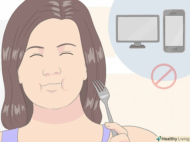 Приймайте їжу усвідомлено, щоб не поспішати під час їжі.усвідомлений прийом їжі допомагає прислухатися до своїх відчуттів, вчасно відчути ситість і завдяки цьому менше їсти. Робіть так:[8]- Під час їжі вимикайте телевізор і комп'ютер і відкладайте в сторону свій телефон;