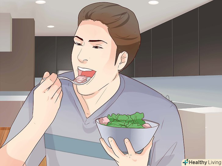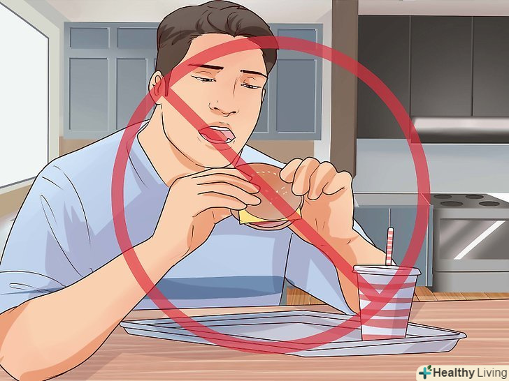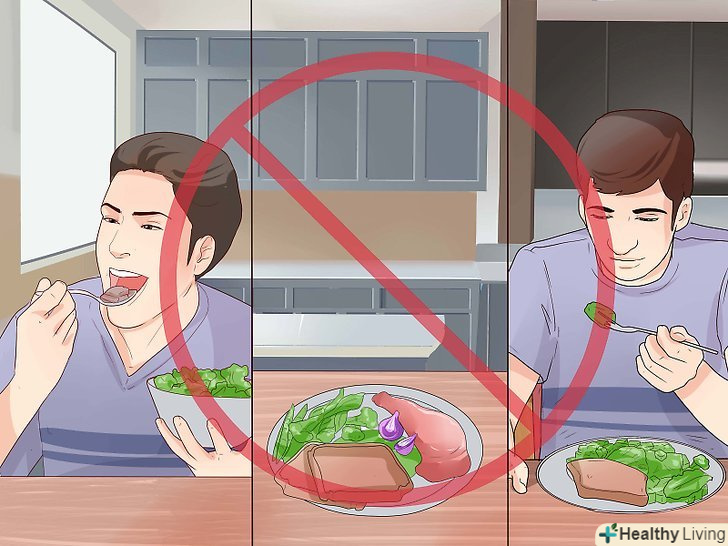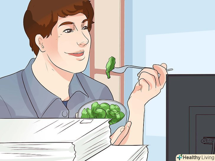 Не пропускайте прийоми їжі.як тільки ви склали план харчування і харчуєтеся по режиму, постарайтеся не пропускати прийоми їжі, навіть якщо у вас немає почуття голоду. Якщо ви будете відтягувати черговий прийом їжі, до тих пір поки не зголоднієте, ви ризикуєте переїсти.[11]- Коли ви сидите і їсте, постарайтеся позбутися від будь-яких відволікаючих чинників, щоб повністю сфокусуватися на їжі. Вимкніть комп'ютер, телевізор і приберіть телефон в сторону. Повільно і ретельно пережовуйте їжу-завдяки цьому ви не з'їсте все в поспіху або занадто швидко.