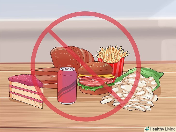 Зменшіть споживання вуглеводів, цукру, тваринних жирів.через продукти з високим вмістом вуглеводів і цукру в організмі виробляється інсулін, який тісно пов'язаний із запасанням жиру. Коли рівень інсуліну падає, тіло спалює жир. Цей гормон впливає на видалення нирками надлишку натрію і води, а це в свою чергу знижує Водний вага тіла.[6]- Уникайте крохмалистих продуктів, багатих вуглеводами, наприклад, картопляні чіпси, картопля-фрі і білий хліб. Уникайте напоїв, які містять цукор, солодкої випічки, тортів, цукерок та іншої подібної їжі.