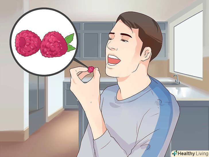 Споживайте натуральний цукор, а не штучний.замість того щоб з'їсти цукерку, з'їдайте який-небудь сухофрукт або фрукт, краще той, який містить мало цукру. Добрими варіантами можуть бути малина, ожина, чорниця або полуниця. Замініть цукор, який ви додаєте в каву вранці, на натуральні цукрозамінники, наприклад, на стевію, мед або сироп агави.[7]- Ваш раціон харчування повинен грунтуватися, головним чином, на здорових джерелах білка, жирів і овочах. Додайте в нього також "здоровий цукор", наприклад, фрукти.