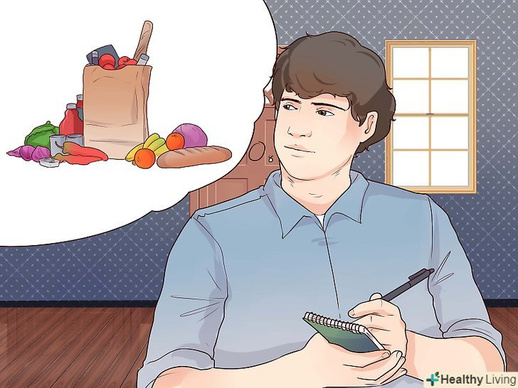 Складайте план харчування на тиждень. Ваш план харчування повинен включати три основних прийому їжі (сніданок, обід і вечеря), які повинні бути в один і той же час, а також двох перекусів (між сніданком і обідом і між обідом і вечерею) – їсти потрібно в один і той же час дня. Це гарантує те, що ви будете дотримуватися режиму харчування протягом дня. Не пропускайте прийом їжі ні в якому разі! З'їдайте близько 1400 калорій в день і не забувайте про фізичні навантаження – це дозволить вам позбавитися від зайвої ваги.[8][9]- Заздалегідь складайте список продуктів, які необхідно купити, і робіть всі покупки на тиждень в неділю. Зберігайте всі необхідні продукти в холодильнику. Завдяки цьому ви весь тиждень зможете швидко приготувати собі здорову їжу.[10]