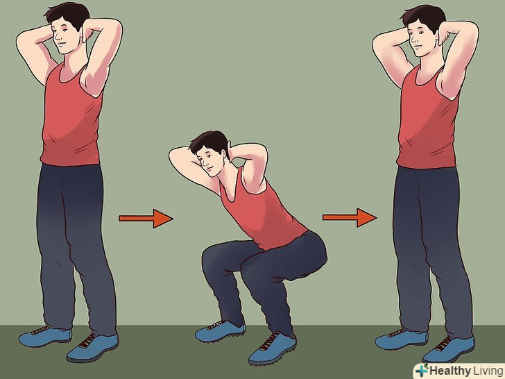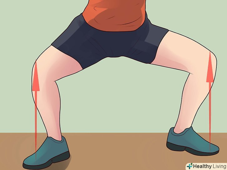 - Коліна повинні знаходитися на одній лінії зі ступнями - не висувайте їх вперед. Стегна повинні бути паралельні підлозі. Якщо ваші п'яти піднімаються вгору, поверніться у вихідне положення. Видихніть, присядьте і встаньте.