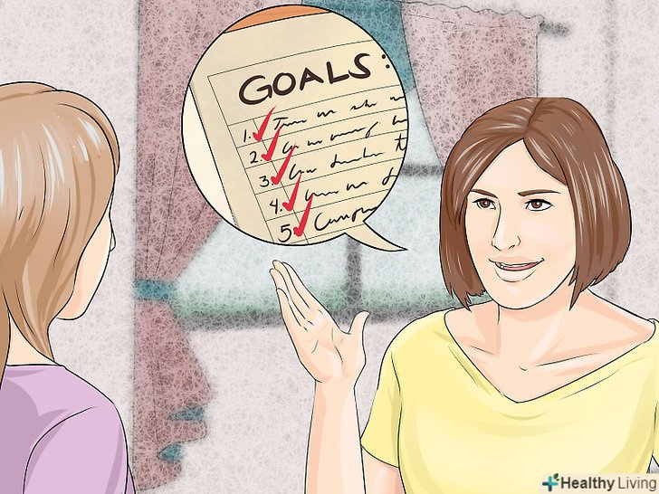 Розкажіть кому-небудь про ваші цілі, щоб «звітувати» перед ним.якщо ви вирішите присвятити когось у ваші цілі і регулярно розповідати йому про свої успіхи, це допоможе вам не кинути розпочате, особливо якщо ця людина щиро Вас підтримує. Розкажіть подрузі, члену сім'ї або лікаря про свої цілі в плані схуднення і харчування. Попросіть цю людину щотижня запитувати, як у вас йдуть справи і як ви просуваєтеся до мети.[14]- Звітуйте і перед самою собою. Регулярне зважування, ведення щоденника харчування, контроль рівня інсуліну допоможуть вам не збитися зі шляху до вашої мети.