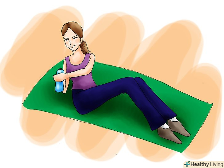 Тренуйте "Російський поворот". Сядьте на землю, коліна зігніть перед собою. Підніміть стегна перед собою і злегка виштовхніть таз, створюючи відчуття, що вашому пресу потрібно старанно працювати, щоб підтримувати положення сидячи.- Візьміть в руки маленьких кульку або невелику пляшку води. Відхиліться назад. Повертайтеся в талії до тих пір, поки кулька не торкнеться землі біля правого стегна. Поверніться в положення по центру і виконайте поворот в ліву сторону. Виконайте 2 підходи з 20 повторень, рухаючись повільно і усвідомлено.