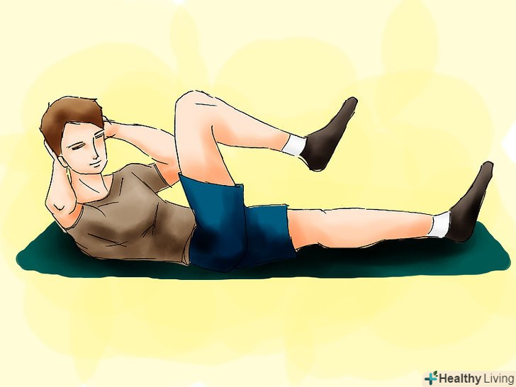 Робіть поперечні кранчі.ляжте на спину, ступні підняті і створюють кут в 90 градусів. Покладіть руки за голову і виконуйте підйоми грудей, задіявши тільки м'язи черевного преса.- Лікті за головою розведіть в сторони, виконуйте підйом і поворот, намагаючись доторкнутися правим ліктем до лівого коліна. Це буде неможливо на самому початку тренувань, так що просто піднімайтеся і повертайте корпус так далеко, як тільки можете. Повторіть 20 разів на кожну сторону.