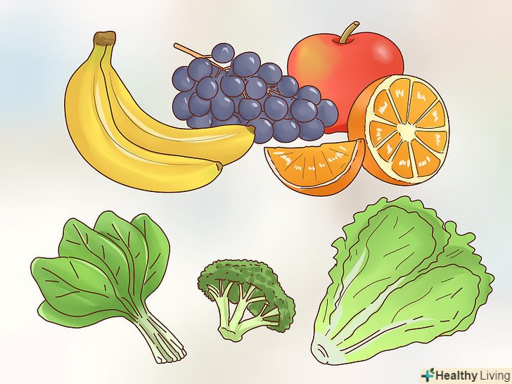 Їжте якомога більше фруктів і овочів.можливо, ви десь чули, що потрібно їсти веселку, і це правда. Чим більше їжі різних кольорів, тим краще. Як це зробити? Овочі та фрукти! У поживному відношенні вони безцінні-в них повно вітамінів і мінералів і зовсім небагато калорій. Ви можете їсти салат кілограмами, і все буде нормально-уявіть, якби ви їли кілограмами смажену курку!- Зелені листові овочі особливо корисні. Шпинат, листова капуста, латук, брюссельська капуста, капуста і брокколі? Відмінний вибір. Але морква, цибуля, перець, гарбуз — більш яскраві овочі — теж хороші.