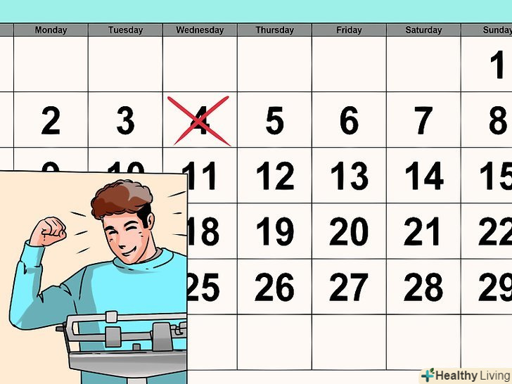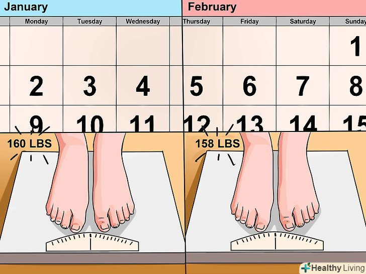 Ставте перед собою маленькі цілі.зважуйтеся раз на тиждень або частіше. Маленькі цілі допоможуть вам йти до мрії, і Вам буде простіше бачити, що ще потрібно змінити.- Слідкуйте за тим, щоб ваші дії були послідовними. Послідовність грає важливу роль в процесі схуднення. Якщо ви зважуєтеся після пробудження, робіть це кожен раз в один і той же час.[7]