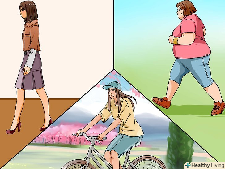 Почніть з кардіонавантажень.кардіонавантаження включають в себе різні види спорту: ходьбу, біг, їзду на велосипеді, веслування і так далі. Такі навантаження пов'язані з подоланням великої відстані. Запитайте лікаря, чим вам можна займатися. Плавання не дає великого навантаження на організм і суглоби, а біг може викликати проблеми з колінами.- Виконуйте потрібну кількість кардиоупражнений. Щоб спорт приносив максимум користі, вам буде потрібно не менше 30-50 хвилин кардионагрузок за тренування. Цей час дозволить вам ефективно спалювати жир.[6]
