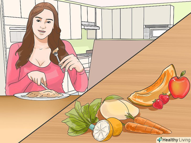 - Наповнюйте половину своєї тарілки фруктами або овочами. Або додавайте одну-дві порції того чи іншого в кожен прийом їжі. Одна порція дорівнює чотирьом повним столовим ложкам вареної капусти або шпинату, одному середньому фрукту (наприклад, яблуко або груша), 30 грамам сухофруктів (наприклад, родзинки) або п'ятисантиметровому скибочці великого плоду (наприклад, диня або папайя).[7][8][9]