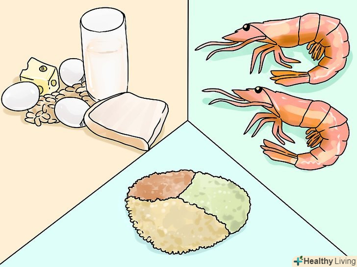Вибирайте нежирні джерела білка.крім зменшення розмірів порцій, слід віддавати перевагу корисної для здоров'я їжі, яка містить невелику кількість калорій. Вибирайте нежирну білкову їжу, щоб звести до мінімуму кількість споживаних калорій.- Нежирна білкова їжа містить мало жирів і калорій і велику кількість білка. Крім того, вона допомагає довше залишатися ситим, і у вас рідше буде виникати бажання перекусити протягом дня.[5]