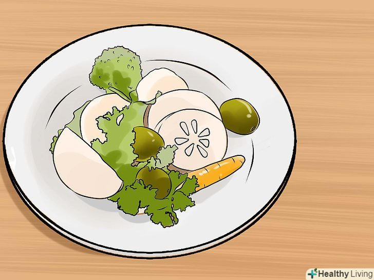 При кожному прийомі їжі половина повинна припадати на фрукти і овочі.слідкуйте, щоб половину вашого раціону становили овочі і фрукти — це прекрасний спосіб обмежити число калорій і збільшити споживання поживних речовин.- І фрукти, і овочі містять мало калорій і багаті поживними речовинами. Якщо половину ваших страв і легких закусок буде складати низькокалорійна їжа, це допоможе скоротити загальну кількість щодня споживаних калорій.[8]