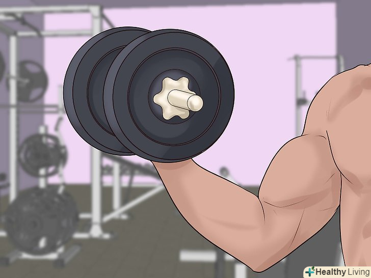 Приступите до силових тренувань.ще одним типом занять є силові вправи, або тренування з опором або обтяженнями. На відміну від кардіо-тренувань, силові вправи дозволяють наростити м'язову масу і прискорити обмін речовин.[27]- Якщо ви ведете малорухливий спосіб життя, почніть зі збільшення фізичної активності і кардіо-вправ. Після того, як Ви зможете без зусиль виконувати кардіо-вправи, почніть включати в свої тренування силові вправи. Може бути непросто поєднувати три види активності одночасно.