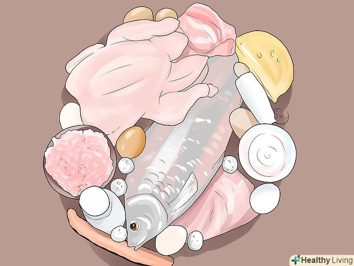 Вживайте достатньо білка.білки необхідні різним тканинам тіла, внутрішнім органам і м'язам, а також імунній і гормональній системі. Здорові худі люди щодня вживають достатню кількість білків, що допомагає їм залишатися ситими протягом усього дня.[13]- Намагайтеся їсти замість жирного м'яса більше нежирної білкової їжі, оскільки в ній міститься менше калорій. Всі худі люди, за винятком вегетаріанців, їдять нежирне м'ясо.[14]