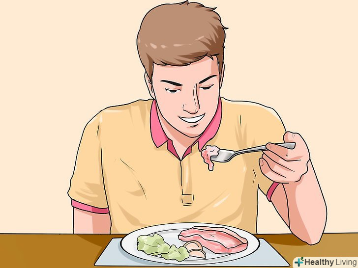 Припиняйте їсти, як тільки задовольните відчуття голоду, не чекаючи, поки відчуєте наповненість шлунка.не їжте кожен раз великими порціями і не наїдайтеся до почуття заповненості шлунка. Замість цього прислухайтеся до сигналів свого організму, щоб знати, коли слід зупинитися.[4] деяким ця здатність дається природним чином, в той час як іншим для її придбання потрібні практика і зосередженість.- Буває складно зупинитися відразу після того, як ви задовольните почуття голоду. Багато їдять до тих пір, поки не відчують, що їх шлунок наповнився, і при цьому з'їдають зайве. Однак якщо ви будете їсти уважно і усвідомлено, ваш організм сам підкаже вам, що він наситився.