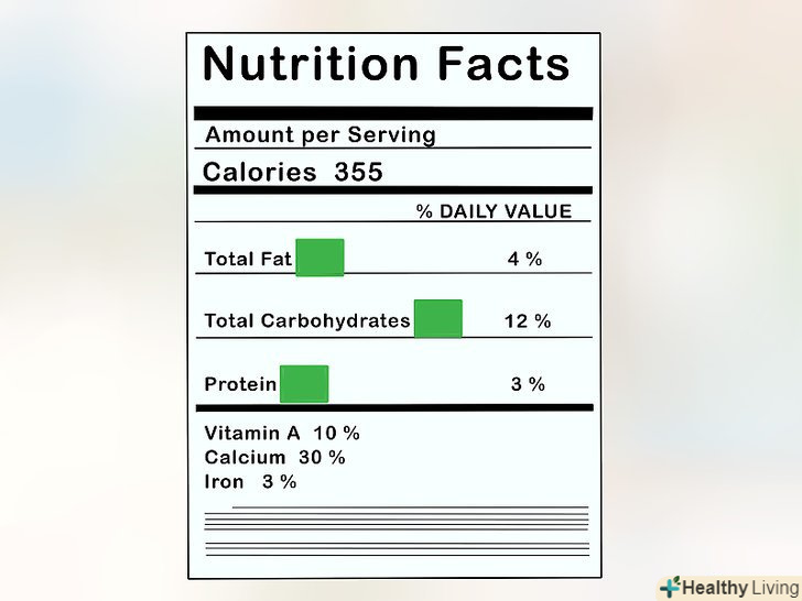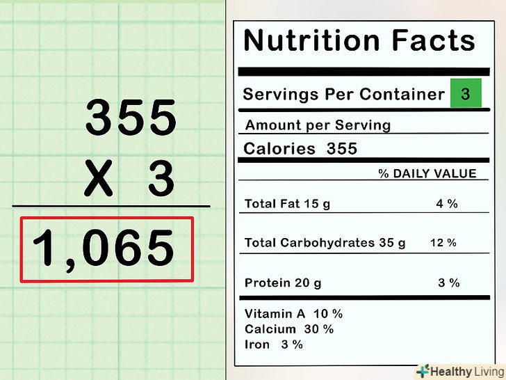 Враховуйте розмір порції.майте на увазі, що показники калорійності і харчовий склад продукту на етикетці зазвичай наводяться для 100 г продукту, рідше — для однієї порції. Якщо маса упаковки більше 100 грам, або вона містить кілька порцій, вміст калорій в ній буде вище. Це важливо враховувати, якщо ваша дієта або план тренувань засновані на підрахунку калорій.[4]- Наприклад, якщо продукт містить 355 калорій на одну порцію, а в упаковці три порції, то всього в ньому міститься 1065 калорій.