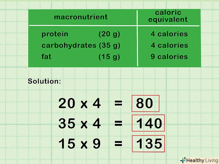 Помножте масу кожного поживного речовини на його калорійність.один грам білка містить приблизно 4 калорії. Один грам вуглеводів-це теж 4 калорії, а один грам жирів — вже 9 калорій. Якщо в продукті, який ви збираєтеся з'їсти, 20 грамів білків, 35 грамів вуглеводів і 15 грамів жирів, щоб дізнатися його калорійність, необхідно виконати наступні розрахунки: 20x4, 35x4 і 15x9. Вийде 80, 140 і 135 калорій відповідно.[3]- Поживні речовини завжди вимірюються в грамах. Якщо ви розраховуєте калорійність їжі самостійно, переконайтеся, що ви використовуєте правильну систему заходів.