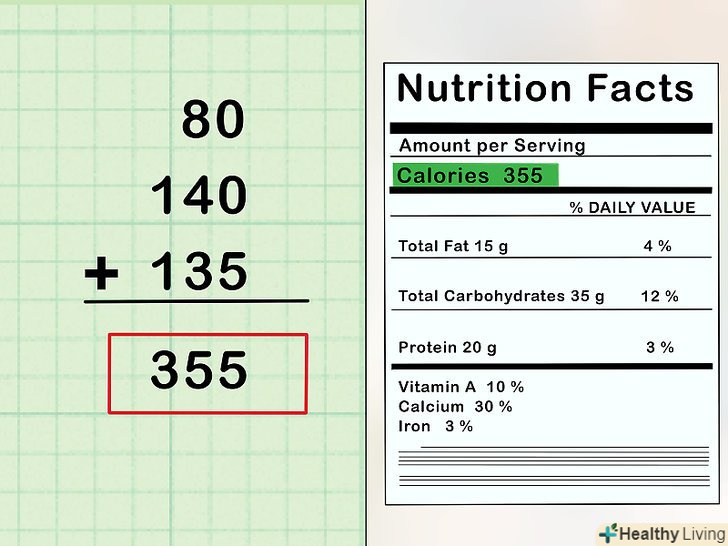 Загальна кількість калорій для кожної поживної речовини.отже, ви з'ясували, яким чином розподіляються калорії в продукті. Тепер складіть ці значення, і ви отримаєте загальну калорійність однієї порції продукту. Якщо повернутися до попереднього прикладу, вона складе 80 + 140 + 135 = 355 калорій. Цей результат повинен збігтися з калорійністю, зазначеної на упаковці продукту.- Якщо ви зумієте визначити, скільки калорій припадає на кожну поживну речовину, а не просто прочитаєте загальний показник калорійності продукту на упаковці, то зможете не тільки дізнатися кількість калорій, але і правильно збалансувати свій раціон.