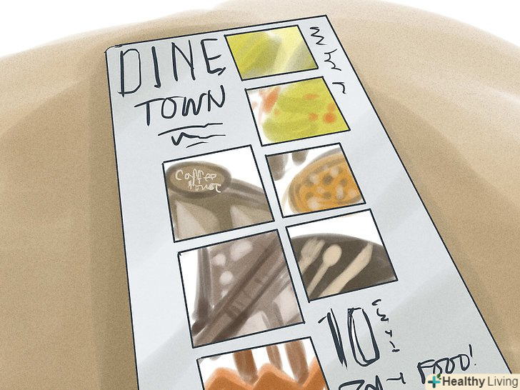 Зробіть замовлення з дитячого меню.страви з дитячого меню стануть відмінним вибором під час дієти. Такі порції, як правило, менше за обсягом, а значить містять менше калорій в порівнянні зі стравами з основного меню. Також в дитяче меню часто входять фрукти.[2]