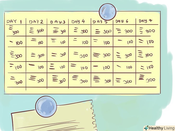 Розробіть план харчування.включіть туди сніданок, обід, вечерю і як мінімум два перекуси кожен день. Продовжуйте харчуватися так протягом 7-10 днів.- Намагайтеся щодня з'їдати три страви по 300 калорій і робити два перекуси по 100 калорій.