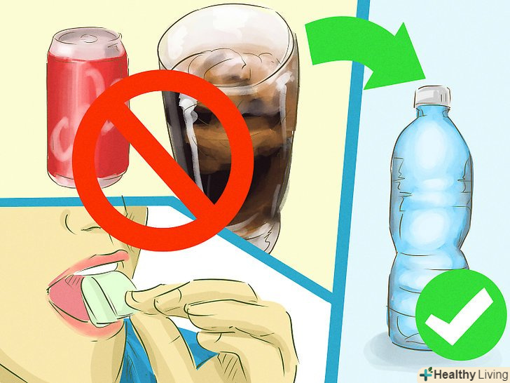 Відмовтеся від жувальної гумки і газованих напоїв.при жуванні гумки ви ковтаєте більше повітря, що може викликати здуття живота або погіршити його. Газовані напої також сприяють здуттю живота.- Замість жувальної гумки спробуйте смоктати м'ятні льодяники, частіше чистити зуби або використовувати рідину для полоскання рота — ці засоби також допомагають освіжити подих.