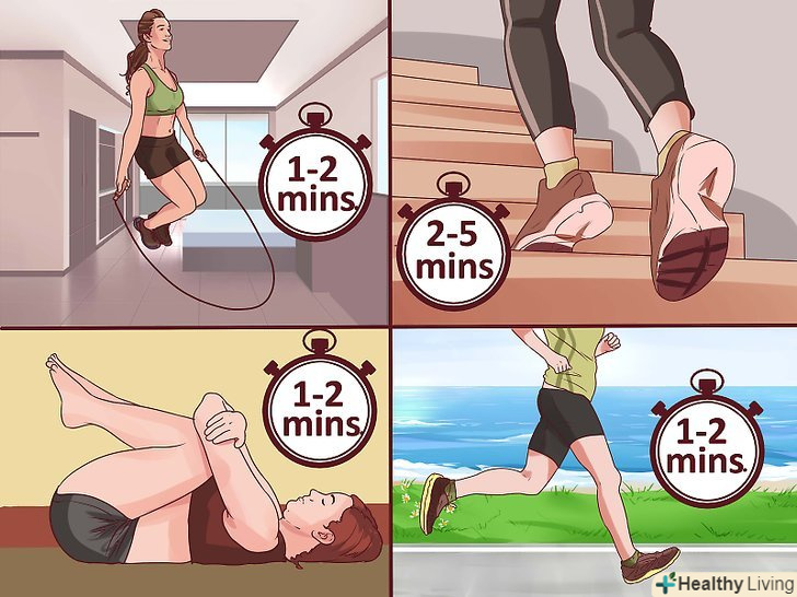 Підготуйте власну програму інтервальних тренувань.інтервальні тренування можна організувати як в спортзалі, так і у себе вдома. Підготовка індивідуального плану занять дозволить найкращим чином підлаштувати його під себе і встановити відповідний Вам рівень інтенсивності вправ.- Стрибки зі скакалкою. Постарайтеся активно стрибати на скакалці 1-2 хвилини, а потім для відпочинку перейти до стрибків помірної інтенсивності. Спробуйте виконувати по 2-5 підходів до стрибків на скакалках.