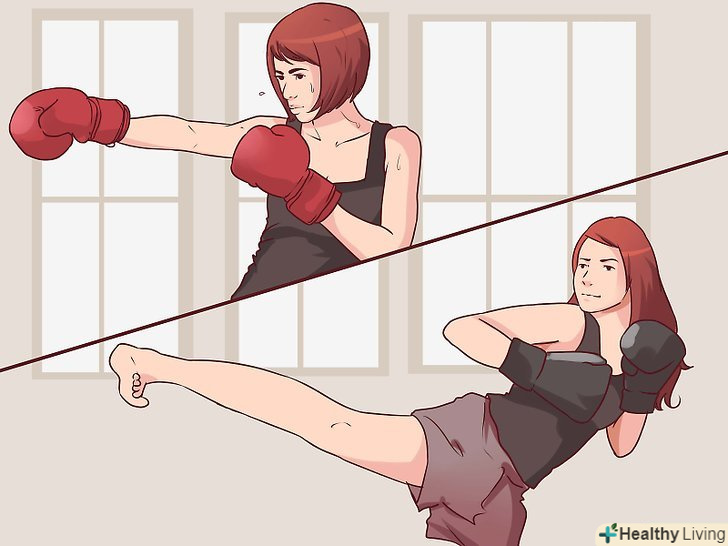 - Відвідуйте уроки боксу або кікбоксингу. На додаток до інтенсивного спалювання калорій, кікбоксинг володіє і іншими перевагами: він дозволяє привести в тонус все тіло, допомагає боротися зі стресом і сприяє підвищенню впевненості в собі.[3]