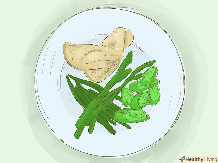 Слідкуйте за розміром страв. Контролюйте розмір порцій і їх склад.[26] постарайтеся зменшити розмір страв, щоб знизити кількість калорій. Денний раціон може складатися з наступного:[27]- 150-190 грамів нежирної білкової їжі, наприклад курятини, квасолі або риби;