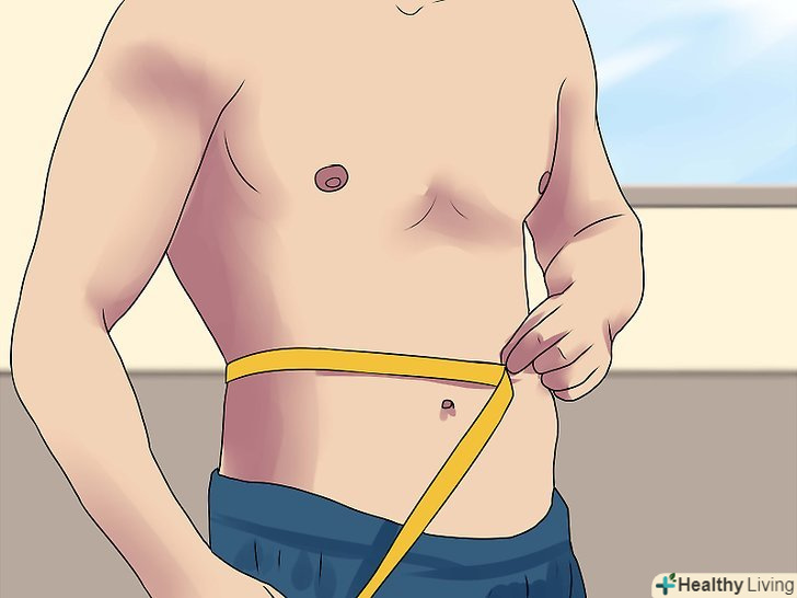 Робіть виміри.крім зважування, ще один ефективний спосіб контролювати прогрес в позбавленні від жиру на животі полягає в тому, щоб стежити за обхватом талії. При цьому слід вимірювати окружність в найвужчому місці талії. У міру зниження кількості жиру на животі обхват талії також буде зменшуватися.[18]- Визначайте обхват талії за допомогою вимірювальної рулетки. Прикладайте рулетку до найбільш вузького місця між нижнім ребром і тазової кісткою. Продовжуйте регулярно вимірювати обхват талії, щоб стежити за своїм прогресом в ході схуднення.[19]