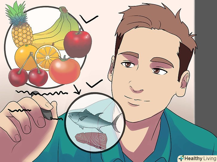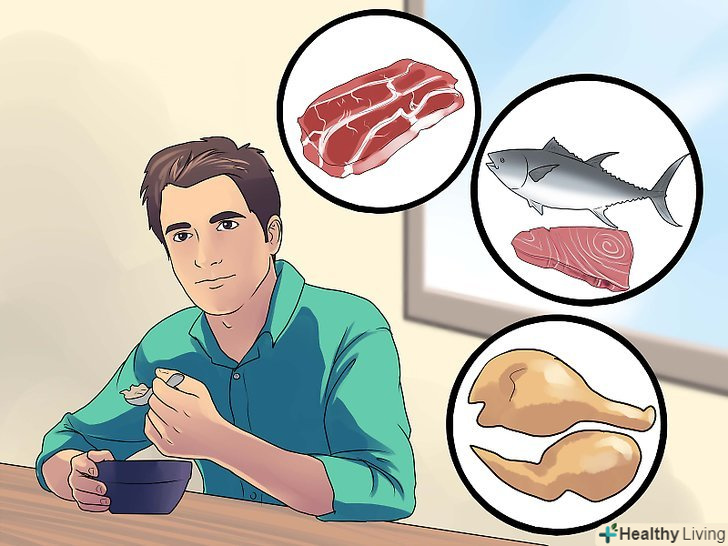 Збільште споживання білка.білкова їжа допомагає чоловікам скинути вагу, позбутися зайвого жиру на животі і зберегти суху м'язову масу.[5] крім того, достатня кількість білків допоможе вам довше залишатися ситим.- Щоб скинути жир, доведіть частку білків до 20-25% своєї денної норми калорій. Наприклад, якщо щодня ви вживаєте 1.600 калорій, необхідно з'їдати 80-100 грамів білка; якщо ваша добова норма становить 1.200 калорій, слід вживати 60-75 грамів білка в день.[6]