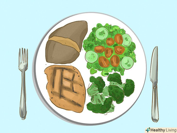 Дотримуйтеся основних правил здорового харчування.протягом дня з'їдайте три невеликі порції, перекушуючи два рази між основними прийомами їжі. Основу кожної страви повинні складати овочі, на другому місці йдуть білки, і потім – вуглеводи. Також в кожному прийомі їжі можуть бути присутніми молочні продукти.- Сніданок: вуглеводи, фрукти, білки