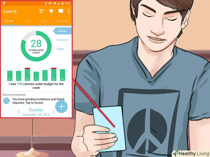Вважайте кількість вживаних калорій.щоб не переїдати, необхідно стежити за тим, скільки калорій ви вживаєте. Не забувайте вивчати склад продуктів і записуйте все, що ви з'їли. Це допоможе вам контролювати своє харчування і не перевищувати рекомендовану норму калорій. Щоб знизити число калорій, уникайте висококалорійної їжі, в якій міститься мало корисних поживних речовин, і віддавайте перевагу багатим поживними речовинами продуктам.[21]- Пошукайте додатки до мобільного телефону, які дозволяють стежити за кількістю вживаних калорій. Є різні програми для точного підрахунку калорій.[22]