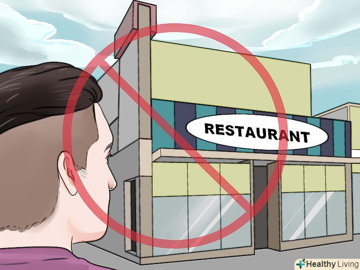 Не їжте занадто часто в ресторанах.як правило, порції в ресторанах більше, ніж потрібно, в результаті чого відвідувачі часто продовжують їсти після насичення. Крім того, в готовій їжі зазвичай міститься велика кількість натрію, який сприяє набору ваги. Намагайтеся рідше харчуватися в ресторанах та інших місцях громадського харчування, щоб легше позбутися зайвої ваги.[25]