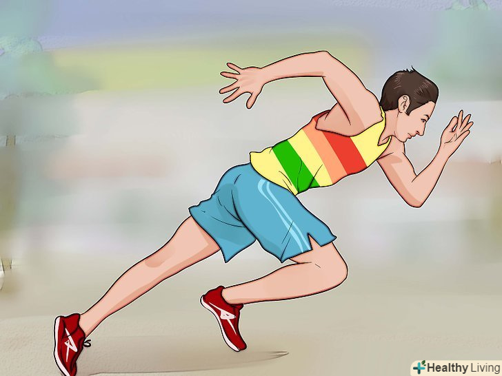 Бігайте на короткі дистанції.при спринті, на відміну від бігу на довгі дистанції, необхідно бігти якомога швидше. В результаті частішає серцебиття і спалюється велика кількість жиру. Крім того, швидкий біг розвиває мускулатуру ніг і живота, а також підвищує витривалість і об'єм легенів.[4] займайтеся бігом так, як описано нижче.[5]- Вийдіть на бігову доріжку або відміряйте 100 метрів по прямій лінії.