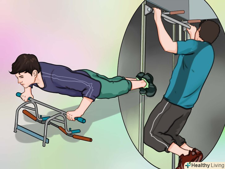 Урізноманітніть свої тренування.можна регулярно тренуватися, але при цьому не помітити бажаних результатів. У фітнесі це явище називається плато. Ваше тіло поступово пристосується до виконуваних вправ, і вони перестануть виробляти помітний ефект. Кардинально змініть режим тренувань, щоб подолати плато.[8]- Спробуйте змінити послідовність вправ. Наприклад, якщо ви звикли спочатку виконувати вправи для м'язів преса, потім трицепсів, біцепсів, спини і ніг, змініть їх порядок.