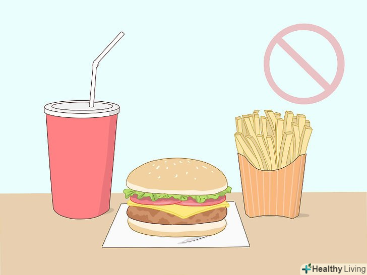 Уникайте страв фастфуду.це може бути досить непросто! Що робити, якщо всі ваші друзі збираються в черговий раз відвідати McDonalds? Спробуйте запропонувати зайнятися після уроків чимось іншим, наприклад прогулятися в парку або послухати музику. Якщо це не спрацює, постарайтеся з'їсти що-небудь корисне, перш ніж приєднатися до друзів. Після цього ви зможете обмежитися склянкою простої води. В такому випадку ви весело проведете час з друзями, але при цьому уникнете шкідливої їжі.[17]- У багатьох ресторанах швидкого харчування є і більш здорові страви, про що знають далеко не всі. Наприклад, можна взяти салат в нежирної заправкою.