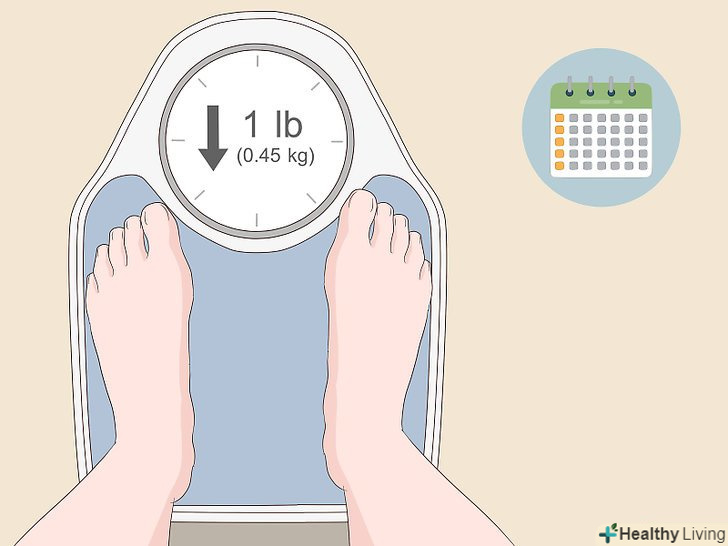 Намагайтеся скидати не більше 0,5 кілограма в тиждень. різні екстремальні та нездорові дієти обіцяють більш швидке схуднення, однак єдиний реальний спосіб схуднути полягає в тому, щоб виробити розумні і здорові звички, а потім дотримуватися їх. Якщо ви будете правильно харчуватися і займатися фізичними вправами, то зможете стабільно худнути приблизно на 0,5 кілограма в тиждень. Якщо ж ви спробуєте скинути вагу швидше, то в кінцевому підсумку знову наберете його після закінчення дієти, так як у вас не буде здорових звичок.[19]- Хоча втрата 0,5 кілограма за тиждень здається досить скромним результатом, це безпечно для здоров'я, і скинутий вага підсумовується. За один рік ви зможете схуднути приблизно на 25 кілограмів!