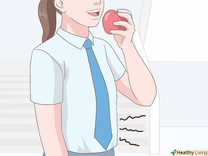 Їжте, коли голодні.не намагайтеся скинути вагу за рахунок недоїдання, інакше ви будете відчувати втому і роздратування і не зможете як слід концентруватися під час занять в школі. Беріть в школу або на роботу що-небудь корисне, щоб в разі необхідності можна було перекусити. Підійдуть крекери з сиром, яблуко, банан, бутерброд з арахісовою пастою або морквяні палички. В цьому випадку вам не доведеться купувати що-небудь не дуже корисне, якщо ви раптом зголоднієте.[21]- Їжте до того, як зголоднієте занадто сильно, інакше сильний голод не дасть вам можливість вибрати корисну їжу, і ви будете готові з'їсти все те, що у вас під рукою.
