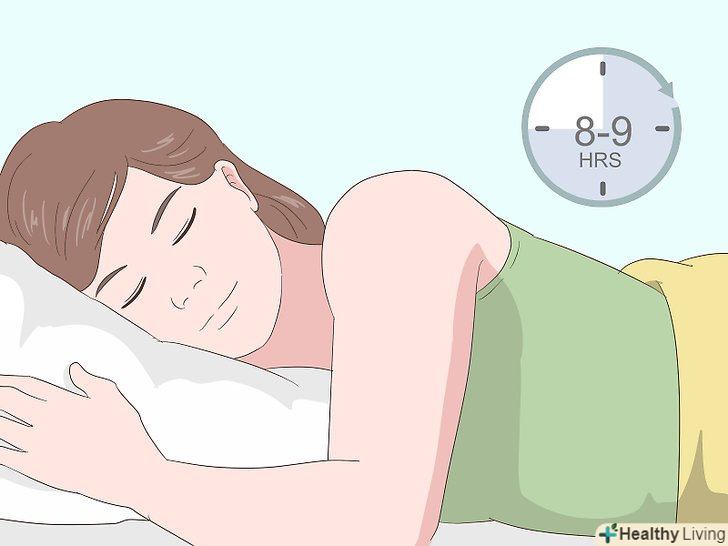 Спіть щоночі по 8-9 годин.якщо ви хочете залишатися здоровою і скинути вагу, надзвичайно важливо приділяти достатньо часу сну. Після 8-9 годин нічного сну ви будете бадьорою і уважною і зможете правильно вибирати корисну їжу. Крім того, здоровий сон допоможе позбутися від стресу і смутку — двох основних причин переїдання.[22]- Вчасно лягайте спати, щоб не перекушувати пізно ввечері шкідливою їжею.[23]