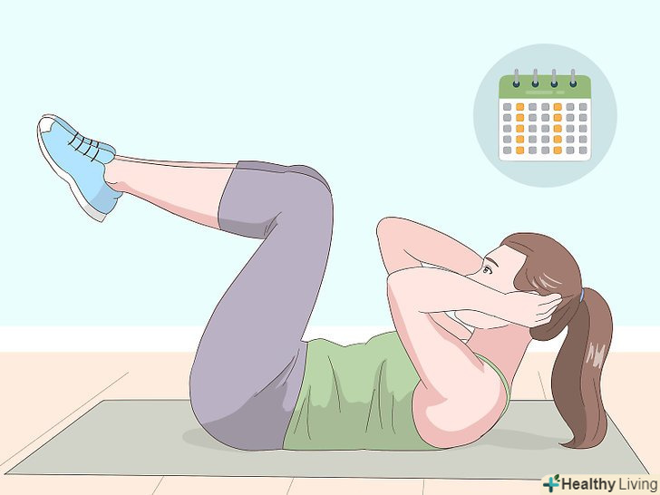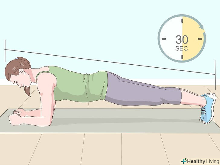 Зміцніть за допомогою вправ м'язи живота.щоб схуднути, необхідно виконувати вправи для всіх груп м'язів. Крім того, можна доповнити свої тренування вправами для преса. Спробуйте виконувати планки-стаєте в позицію для віджимання від підлоги і утримуйте тіло в піднятому положенні на прямих руках або ліктях. При цьому ваше тіло повинно залишатися прямим. Утримуйте таку позу протягом 30 секунд, після чого підніміться.[7]- Виконуйте піднімання ніг: ляжте на спину і піднімайте прямі ноги, а потім знову опускайте їх на підлогу.