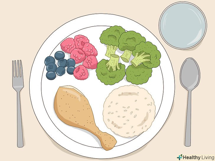 Щодня їжте свіжі фрукти та овочі.намагайтеся включати свіжі фрукти і овочі в більшість прийомів їжі. Наприклад, можна з'їсти який-небудь фрукт разом з кашею на сніданок, салат з бутербродом на обід і варені овочі з куркою і рисом на вечерю.[10]