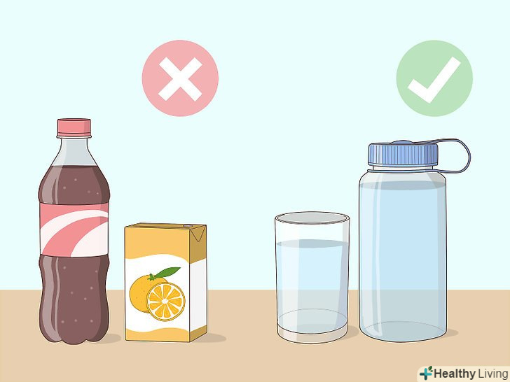 Пийте воду замість газованих напоїв і соків.при вживанні солодких газованих напоїв і соків велика кількість цукру потрапляє прямо в кров, що шкідливо для здоров'я і сприяє набору зайвої ваги. Замість цього щодня випивайте 6-8 склянок (1,5-2 літри) води. Заведіть звичку тримати при собі пляшку з водою протягом дня і періодично відпивайте з неї, не чекаючи, поки відчуєте сильну спрагу. Щоб зберегти здоров'я і скинути зайву вагу, необхідно підтримувати водний баланс організму.[13]- Не докоряйте себе, якщо іноді дозволите собі випити солодкий газований напій або сік. Зрідка можна побалувати себе, однак вода повинна залишатися вашим основним повсякденним напоєм.[14]