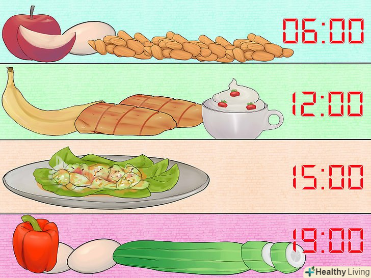 Змініть режим харчування так, щоб включити в нього періодичне голодування.періодичне голодування є одним з кращих способів швидко скинути вагу, проте ніхто ще ніколи не говорив, що воно приносить задоволення. Найчастіше при періодичному голодуванні пропускають сніданки, що дозволяє зробити інтервали між прийомами їжі по 18 і більше годин. Замість сніданку після пробудження можна перекусити одним бананом. Потім пообідайте і повечеряйте (можна також злегка перекусити між цими основними прийомами їжі, особливо якщо ви займаєтеся спортом), після чого не їжте до наступного дня.- Така стратегія годиться лише для короткочасної втрати ваги. У довгостроковій перспективі важливо з'їдати збалансований сніданок щоранку, так як пропуск сніданку часто призводить до переїдання в подальшому.