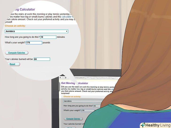 Записуйте кількість спалюваних калорій.у вік інформації це легше, ніж будь-коли, так як існує безліч додатків і програм, які допоможуть вам відстежувати спалювані калорії. Перевірте, чи немає у вашому смартфоні відповідної програми, або зайдіть в інтернет в кінці дня, наберіть в пошуковику» лічильник калорій " і введіть всі види фізичної активності, якими ви займалися протягом дня. Це необхідно для того, щоб переконатися, що ви кожен день скидаєте потрібну вагу.