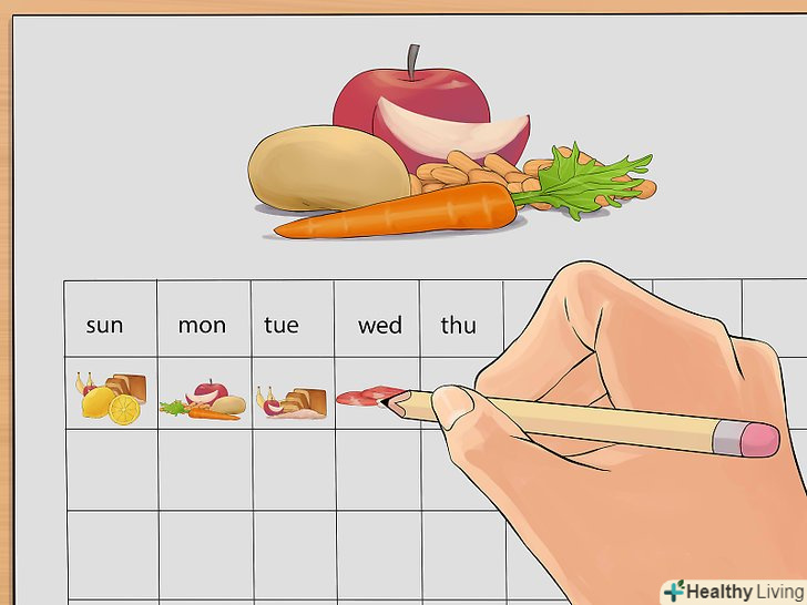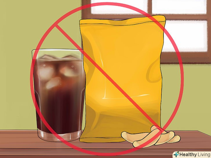 Перегляньте своє ставлення до легких закусок.не тримайте в будинку чіпси і солодку газовану воду — навіть якщо вони будуть здаватися вам «випадковим ласощами», в кінцевому підсумку ви все це з'їсте і вип'єте. Позбавтеся від спокуси, і вам вдасться набагато легше дотримуватися дієти. Просто не купуйте нездорову їжу і не тримайте її вдома. Ви здивуєтеся, наскільки легше вам буде дотримуватися дієти при відсутності спокус.- Відвідуйте продуктові магазини з готовим списком і купуйте тільки те, що зазначено в ньому. Таким чином ви зможете ефективніше планувати своє харчування і будете купувати тільки здорову їжу.