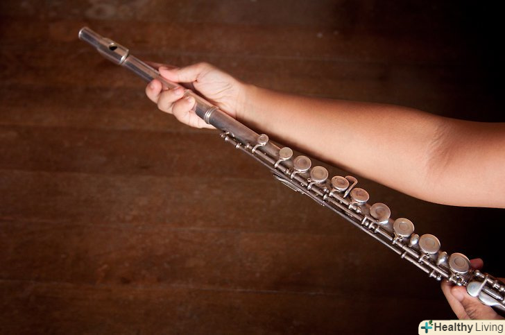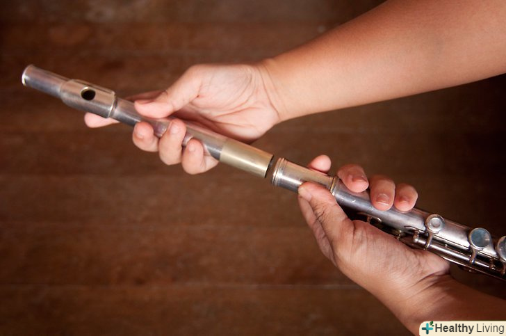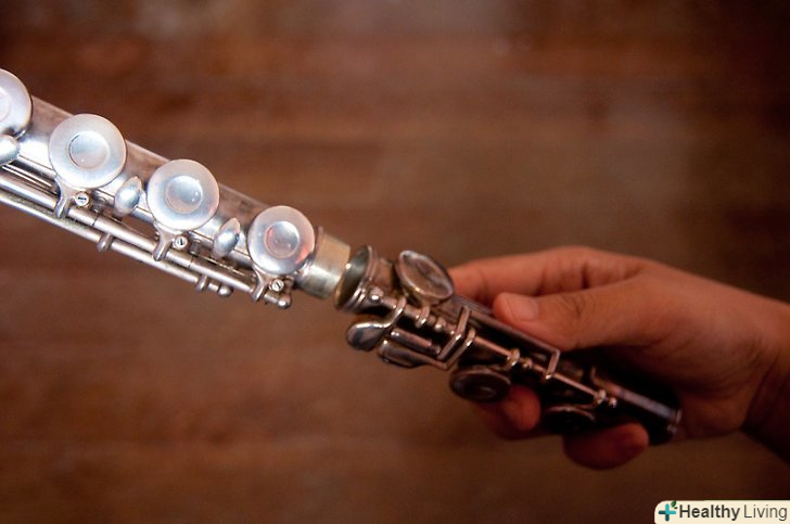 Приєднайте голову до тіла.обережно дістаньте тіло з футляра за кінець, не за клапани. Далі, тримайте тіло за стовбур (гладка частина без клавіш на одному з кінців) і, іншою рукою, приєднайте голову. Акуратно скрутіть їх разом: губка на голові флейті повинна бути на одній лінії з клапанами, розташованими на тілі. Пам'ятайте, що прокрутка тіла або голови флейти назовні знижує тон, а всередину — підвищує.
